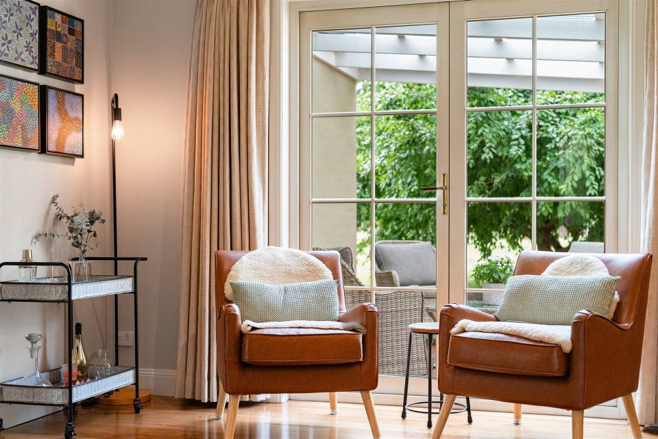 Entering the home, guests are led past the formal lounge and into a sunny sitting space. With a wood heater in one corner and the U-shaped kitchen steps away, it’s the ideal spot to enjoy a good book or cup of tea.