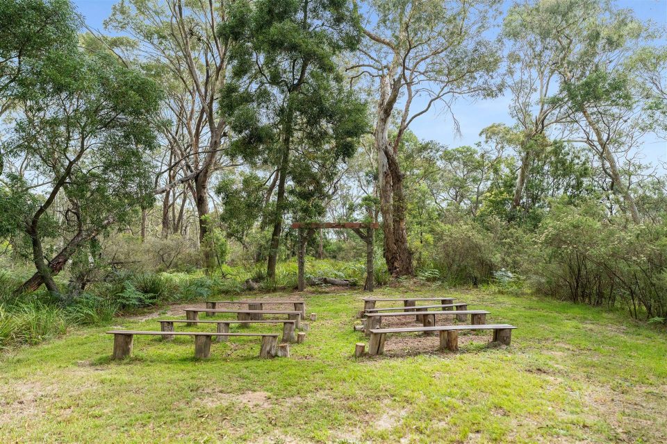 Quaint walking paths traverse acres of native bushland on the north side of the property, winding through mature eucalypts and soft ferns.