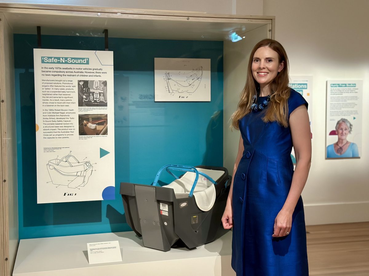 ‘In Real Life’ exhibition co-curator Lucie Shawcross with the original Safe and Sound baby capsule. Photo: James Coleman.