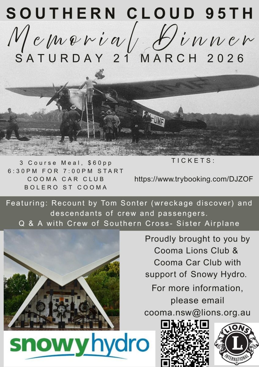 The Southern Cloud Memorial Dinner will be held on 21 March at the Cooma Car Club. Tickets are available via trybooking. For more details of the weekend and the planned schedule, visit the Cooma Lions Club Facebook page or email [email protected].