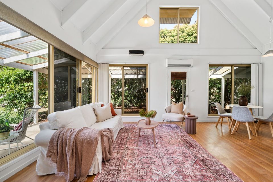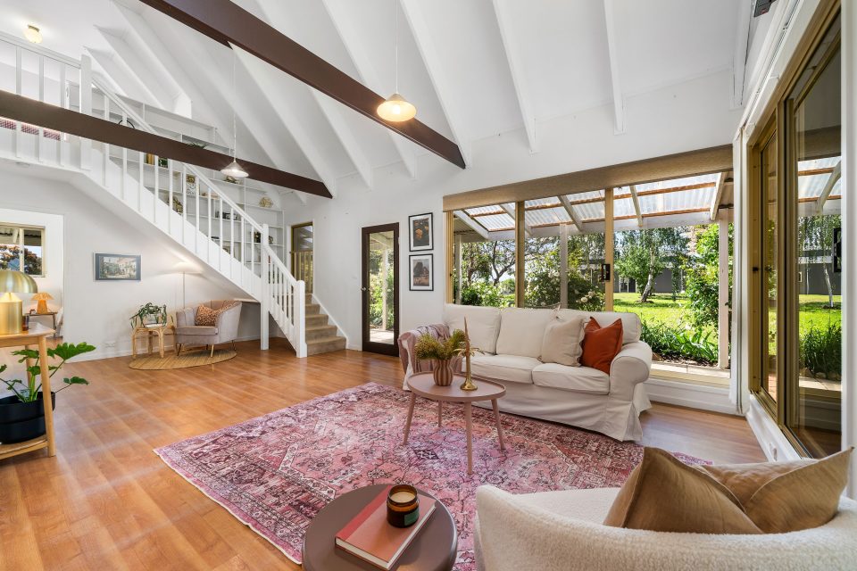 “The main living space is open and airy, with raked ceilings, exposed beams and large windows that bring in plenty of natural light.