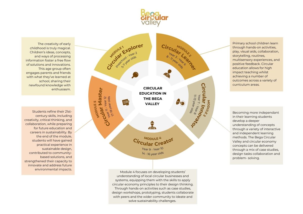 The framework has five progressive modules spanning Kindergarten to Year 12 that slowly teach the foundations and pillars of the circular economy over 14 years.