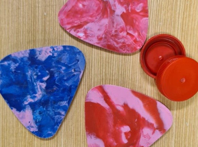 Children collected HDPE bottle caps from local cafes and schools to create products such as coasters, wax combs, herb strippers and chopping boards. Photo: Supplied.