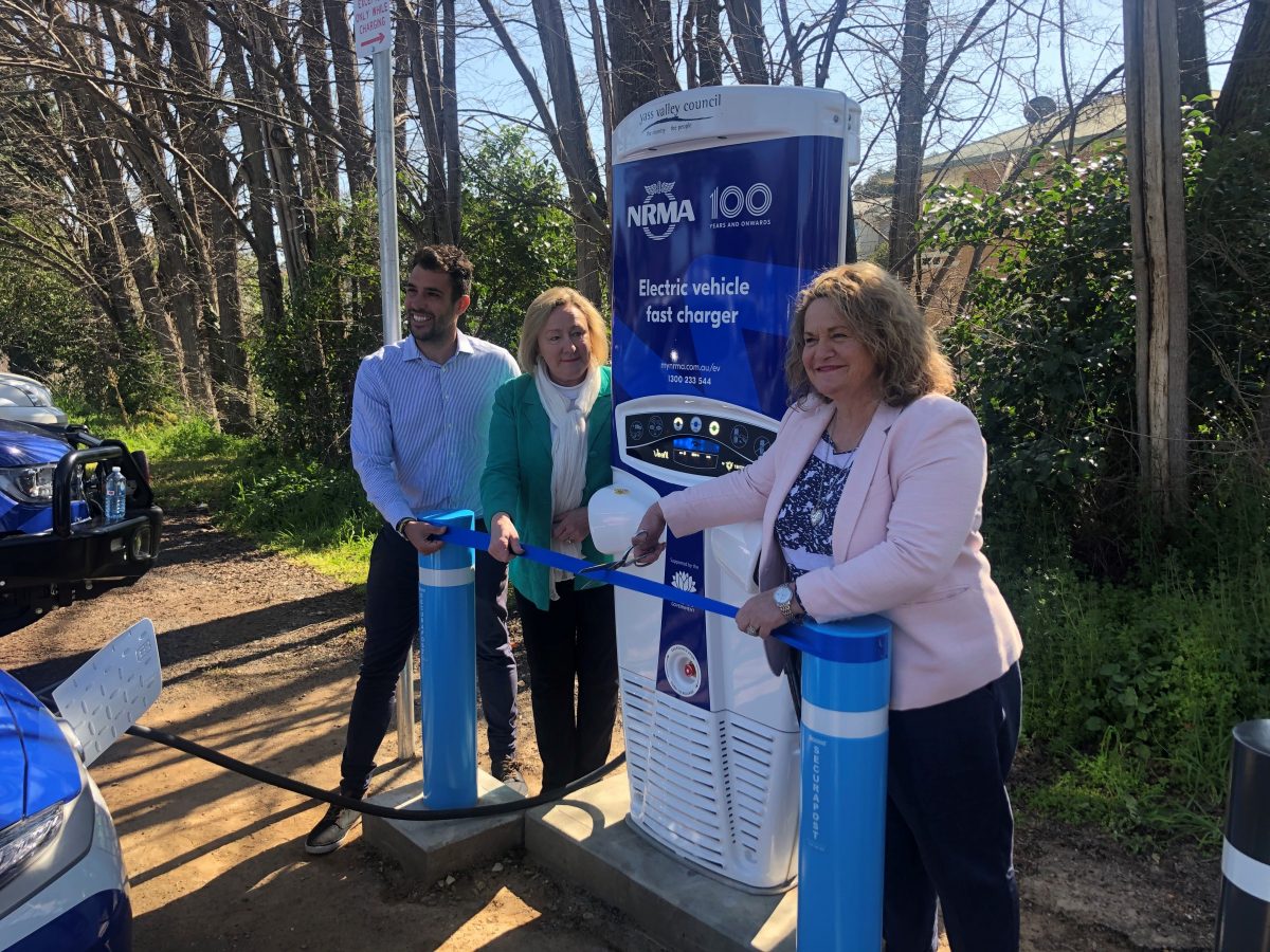 NRMA’s Dan Maranhao unveiling a new EV charger in Yass with Yass Valley mayor Rowena Abbey and member for Goulburn Wendy Tuckerman. Photo: NRMA.