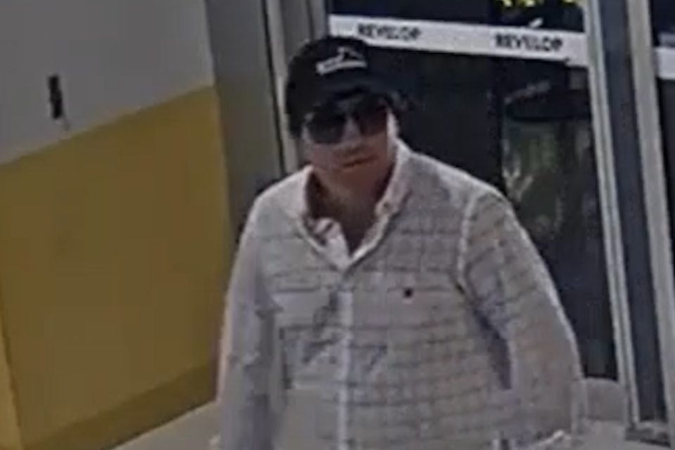 The first man is described as of Caucasian appearance, in his 40s and of solid build. He’s wearing a white with black-checkered long-sleeve shirt, black shorts, sunglasses, and a black hat with a white graphic on the front.