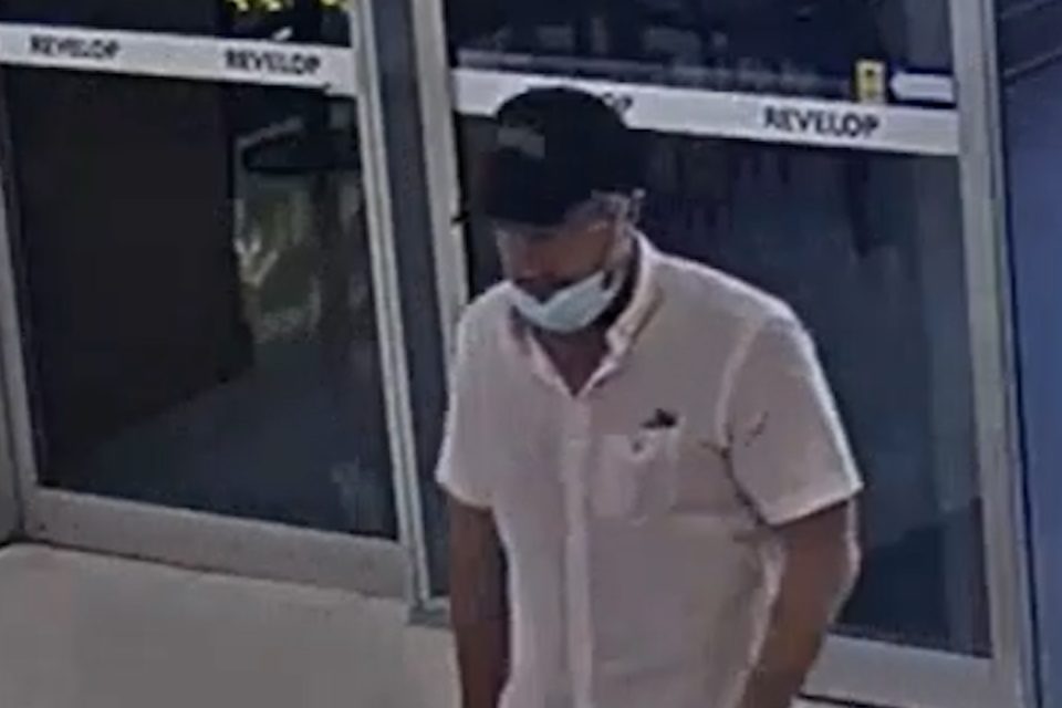 The second man is described as of Caucasian appearance, in his 40s and of medium build. He’s wearing a white sleeve shirt, black shorts, black shoes with white bottoms, a blue face mask, and a black hat with a white graphic on the front.