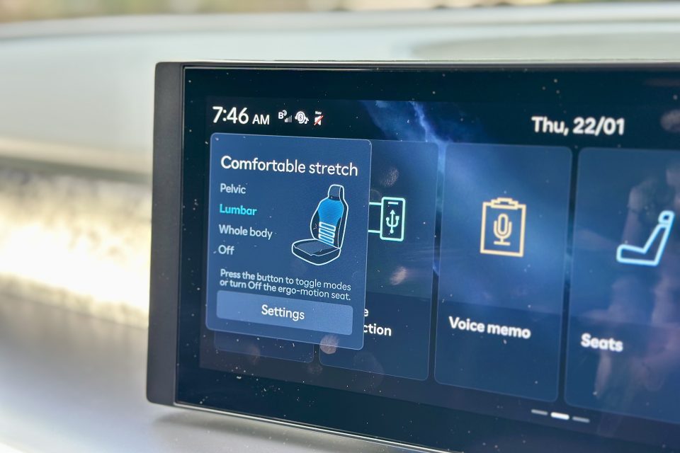 As I discovered after about half an hour on the highway – when the car suddenly decided to start prodding my lower back – my IONIQ 9 also came with massage seats for the driver and front passenger. You can choose between lumbar, pelvic and whole-of-body massages, and all are rather pointy and powerful. My back’s jury is still out on descriptors like “nice” and “therapeutic”, though.